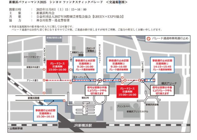 2025年は16年ぶりにアリーナ通りを歩行者天国化し、大道芸のパフォーマンスや300人規模の「シンヨコ・ファンタスティックパレード」が復活。駅前広場、日産スタジアム、横浜アリーナを結ぶシャトルバスも運行され、街全体がひとつに繋がります。